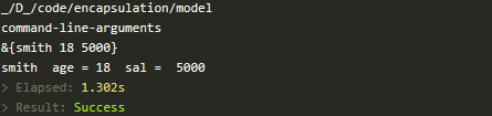 package mainimport ( "fmt" "../model")func main() { p := model.NewPerson("smith") p.SetAge(18) p.SetSal(5000) fmt.Println(p) fmt.Println(p.Name, " age =", p.GetAge(), " sal = ", p.GetSal())}执行效果如下图所示:
