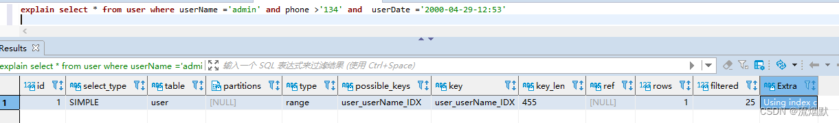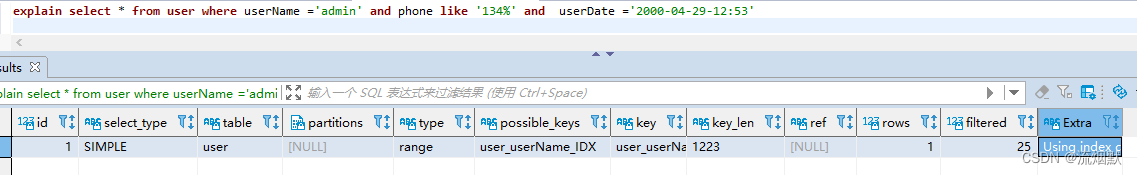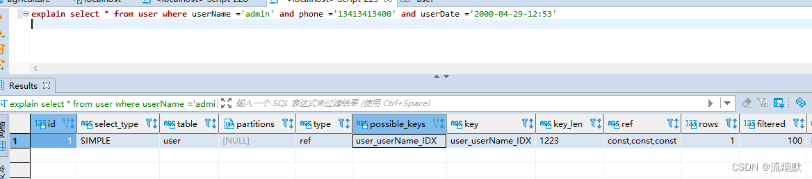 explain select * from user where userName ='admin' and phone like '134%' and userDate ='2000-04-29-12:53'