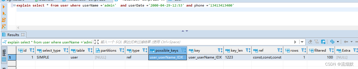 explain select * from user where userName ='admin' and userDate ='2000-04-29-12:53' and phone ='13413413400'