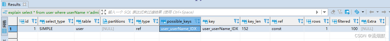explain select * from user where userName ='admin'