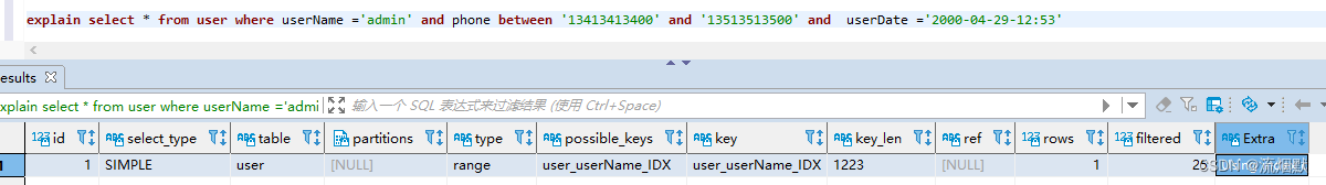 explain select * from user where userName ='admin' and phone between '13413413400' and '13513513500' and userDate ='2000-04-29-12:53'
