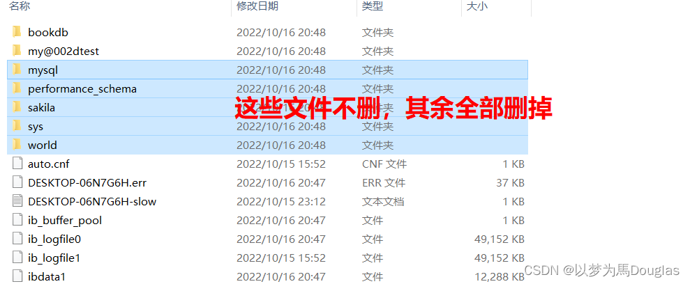 【第七步】在如同第一步的路径下找到mysql的data数据目录,删掉除了以下文件的其它所有文件。
