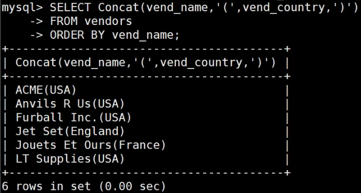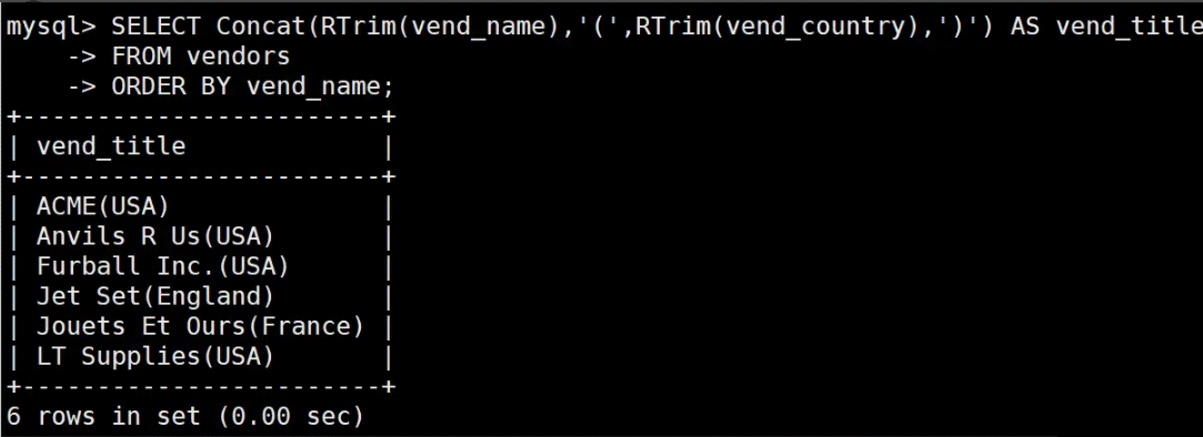 SELECT Concat(RTrim(vend_name),'(',RTrim(vend_country),')') AS vend_title