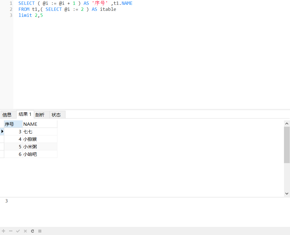SELECT ( @i := @i + 1 ) AS '序号' ,t1.NAME FROM t1,( SELECT @i := 2 ) AS itable limit 2,5