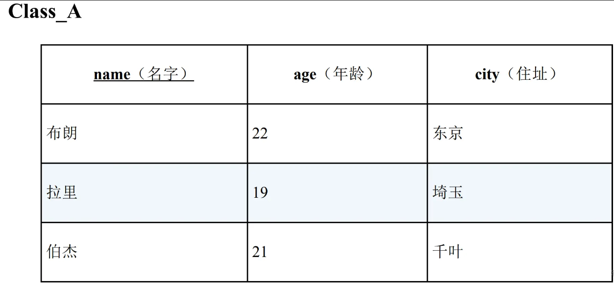 查询 “与 B 班住在东京的学生年龄不同的 A 班学生” 。也就是说,希望查询到的是拉里和伯杰。