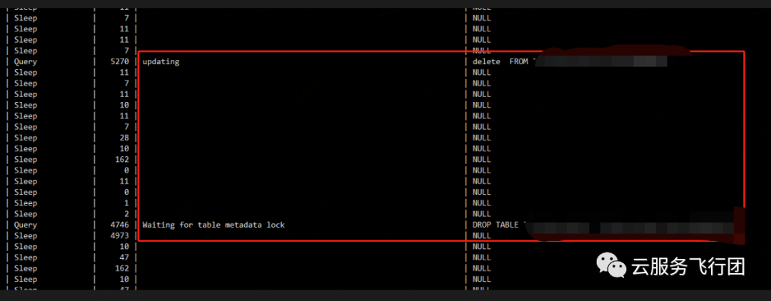 那怎么来解决呢?因为从show processlist以及客户描述可以很清楚的知道故障机制,当时建议客户将delete操作kill掉,等数据回滚完后再执行drop操作因为delete已经执行了一段时间,回滚过程可能会较长,客户最终kill delete后顺利drop成功。