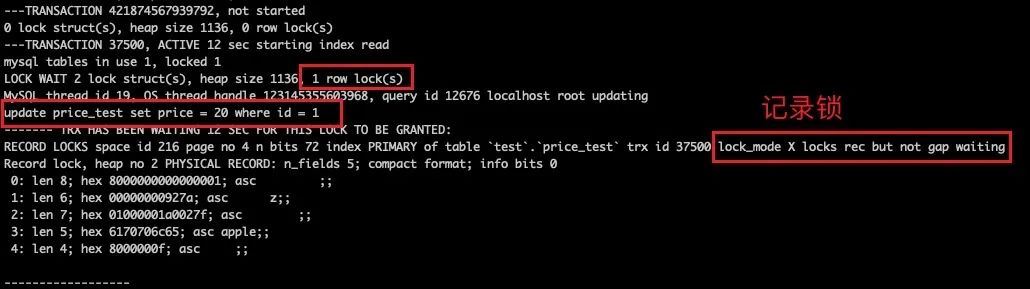 此时,我们通过查看锁信息可以看到,其是加上一个行级别的记录锁,如下图所示。