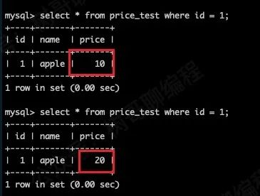 我们往 price_test 表再插入一条数据,此时数据库中的数据如下所示。