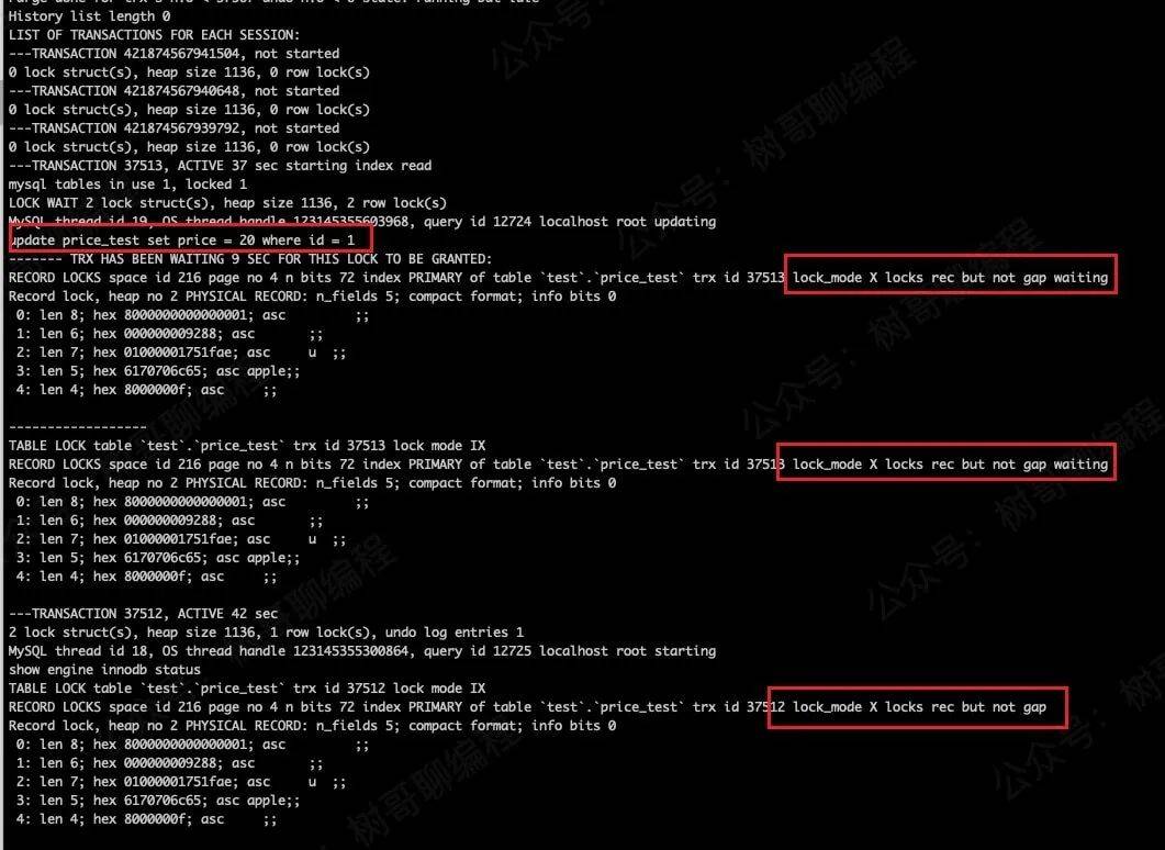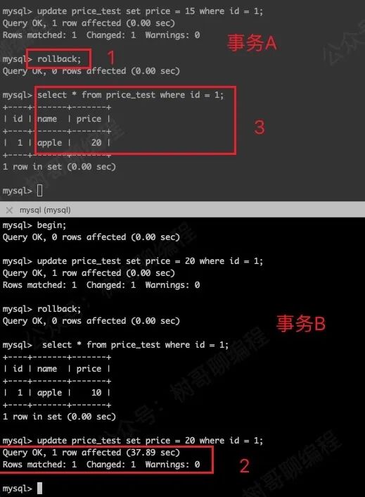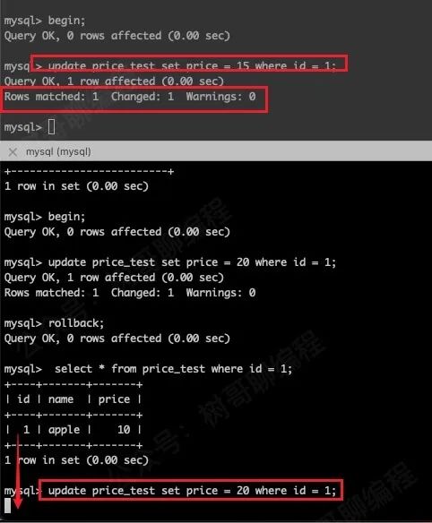 如上图所示,我先用如下命令在事务 A(上边的窗口)执行,将 price 修改为 15。