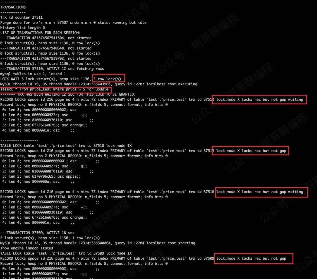 mysql> begin; Query OK, 0 rows affected (0.00 sec) mysql> select * from price_test where price > 15 for update; +----+--------+-------+ | id | name | price | +----+--------+-------+ | 2 | orange | 30 | +----+--------+-------+ 1 row in set (0.00 sec)
