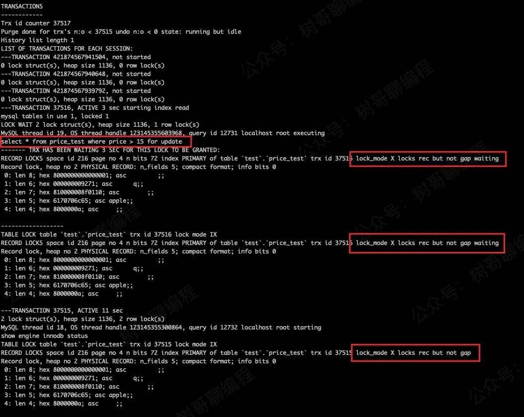 接着,我们在事务 A 执行如下命令,查询 price > 15 的记录。