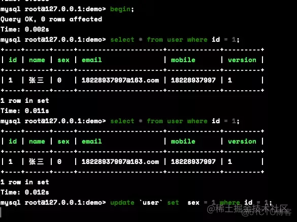 mysql root@127.0.0.1:demo> begin; Query OK, 0 rows affected Time: 0.002s mysql root@127.0.0.1:demo> update `user` set sex = 1 where id = 1;
