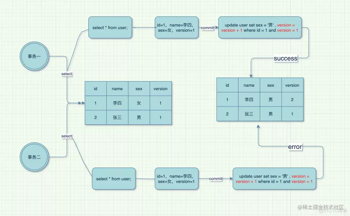 - 另外一个事务也是执行同样的读取操作。当事务一提交时,对版本号执行+1,此时该数据行的版本号就是2。