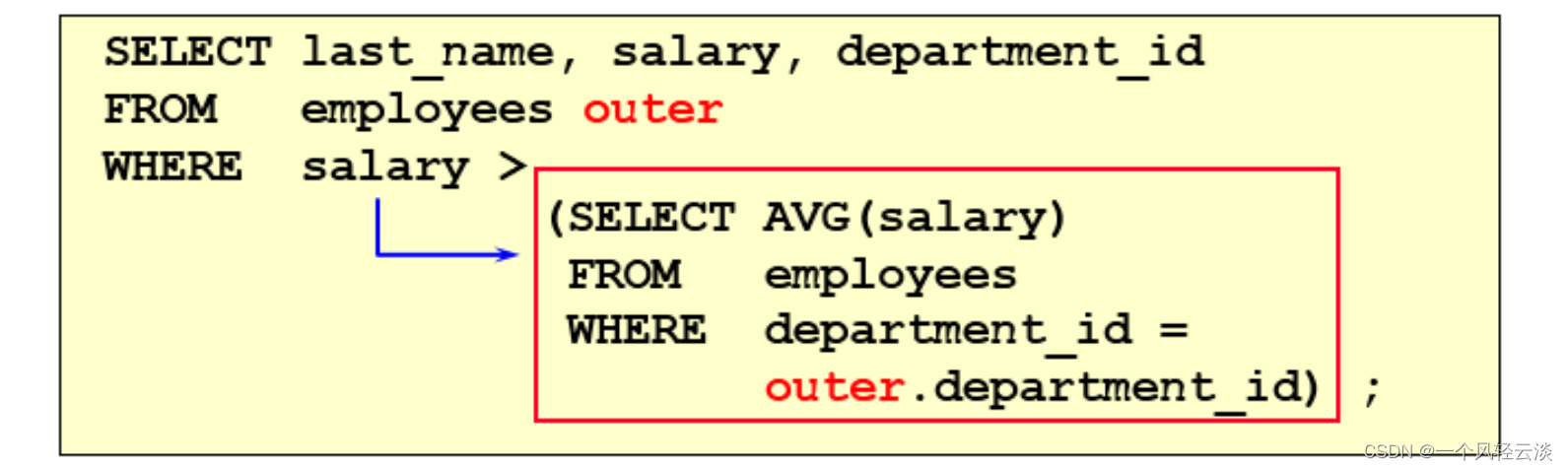 如果子查询的执行依赖于外部查询,通常情况下都是因为子查询中的表用到了外部的表,并进行了条件关联,因此每执行一次外部查询,子查询都要重新计算一次,这样的子查询就称之为 关联子查询 。相关子查询按照一行接一行的顺序执行,主查询的每一行都执行一次子查询。