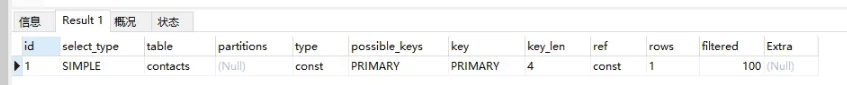 当有UNION时,UNION RESULT的table列包含一个参与UNION的id列表,UNION RESULT总是出现在UNION中所有参与行之后,例如。
