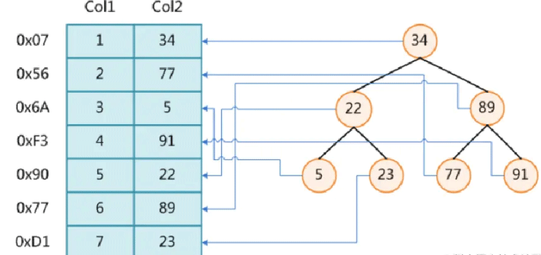 加入要找到 col2 = 23 的记录,如果不使用索引,我们需要对整张表扫描,从 34 -> 77 -> 5 -> 91 -> 22 -> 89 -> 23, 需要对比7次才能找到