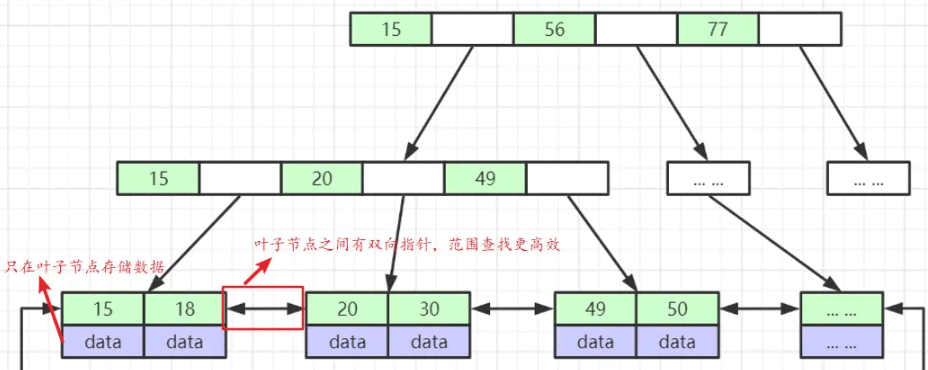 对于B+ 树,我们假设要查找50这个数据,先从根节点即(15 56 77) 这些数据中找到50所处的范围,因为 (15 56 77) 已经是有序的,可以根据二分查找算法找到 50 处于 15--56之间, 然后加载 15 所指向的下一页数据 (15 20 49),再次根据二分查找算法,找到50处于 49之后,再从磁盘加载49所指向的数据页,找到50
