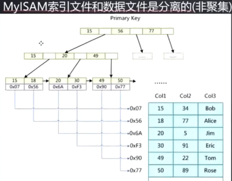 索引结构中的叶子节点的 data 存放的是 数据行的位置,及这一行在 MYD 文件的位置, 而不是直接放的真实数据
