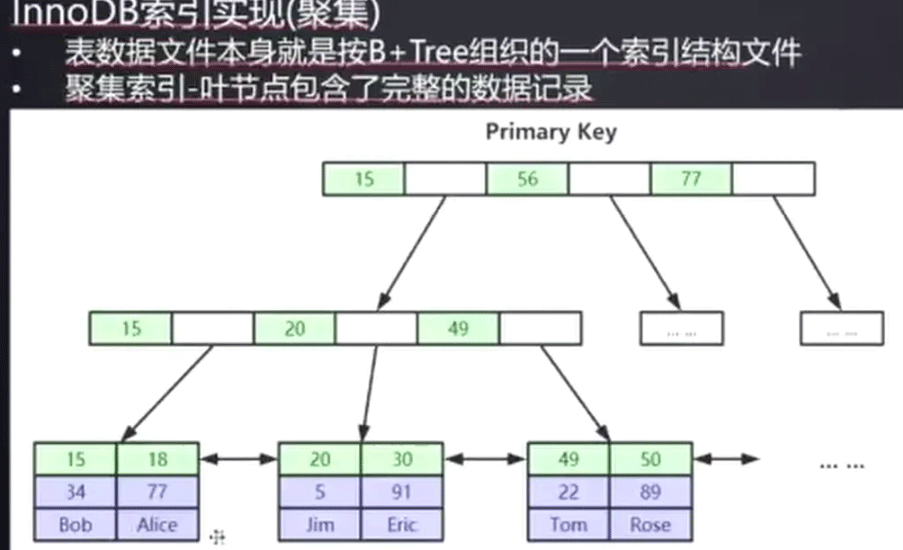 InnoDB 整个表的数据就是用B+ 树组织的,如果存在主键,就用主键为索引,叶子节点存储行数据