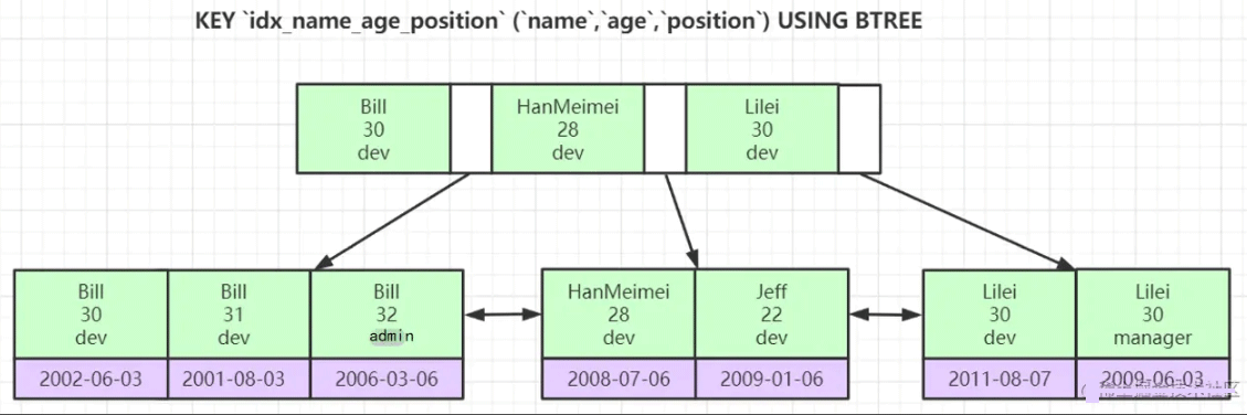 如果是 name = 'Bill and age > 30 and position = 'dev'' , 首先name 可以走索引,name 确定后 age 是有序的,age 也可以走索引,但是 age > 30 导致 age 查出来的数据有多个(31 32), 31 和 32 下的 position (dev admin ) 不是有序的,便无法利用二分算法进行查找。所以无法利用 position 这个索引,这也就是左前缀法则的原理和联合索引失效的原理