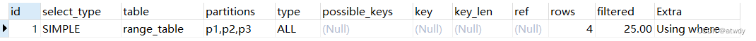 drop table if exists `range_table`; create table `range_table`( `id` int, `name` varchar(10) ) partition by range(id)( partition p1 values less than (10), partition p2 values less than (20), partition p3 values less than maxvalue );