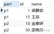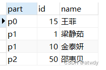 # 插入数据 insert into range_table (id, name) values (1,"梁静茹"),(10,"金泰妍"),(15,"王菲"),(50,"邵夷贝"); # 查看各个分区数据条数 select partition_name,table_rows from information_schema.partitions where table_name = 'range_table';