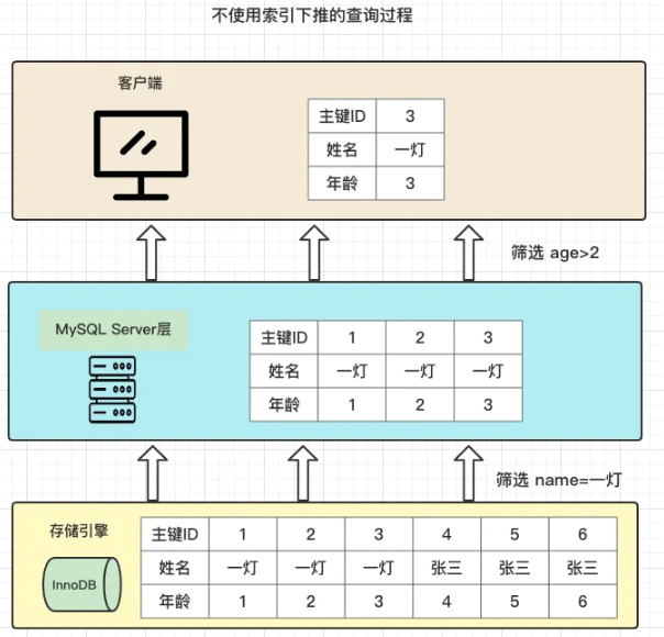 在没有使用索引下推的情况,查询过程是这样的: