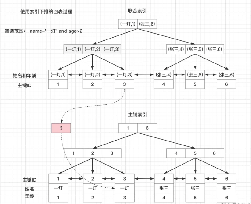 - 先在联合索引上找到name=‘一灯’的3个主键ID