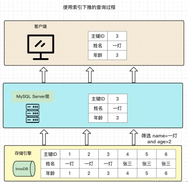 我们再看一下在使用索引下推的情况,查询过程是这样的: