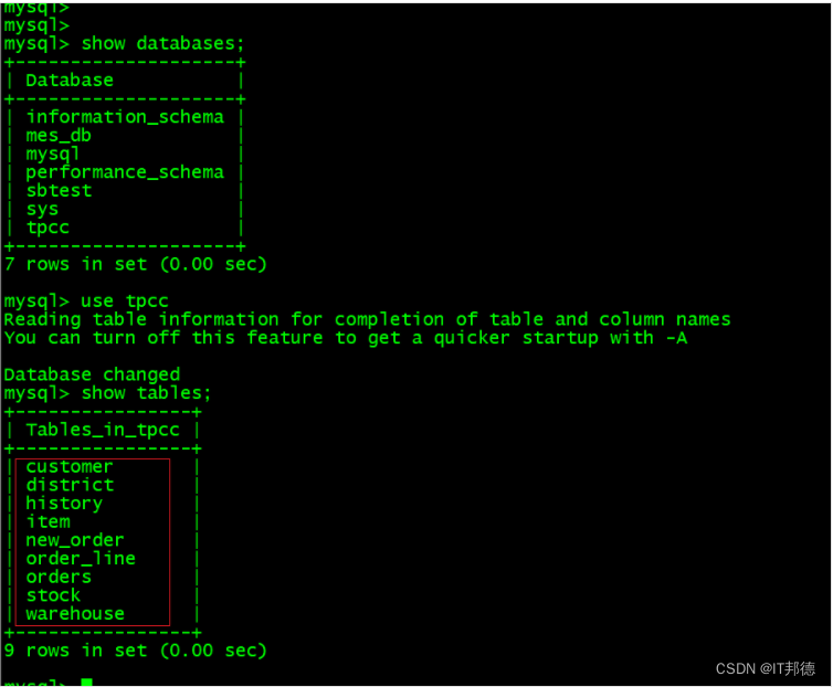 mysql> show databases; +--------------------+ | Database | +--------------------+ | information_schema | | mes_db | | mysql | | performance_schema | | sbtest | | sys | | tpcc | +--------------------+ 7 rows in set (0.00 sec) mysql> use tpcc Reading table information for completion of table and column names You can turn off this feature to get a quicker startup with -A Database changed mysql> show tables; +----------------+ | Tables_in_tpcc | +----------------+ | customer | | district | | history | | item | | new_order | | order_line | | orders | | stock | | warehouse | +----------------+ 9 rows in set (0.00 sec)