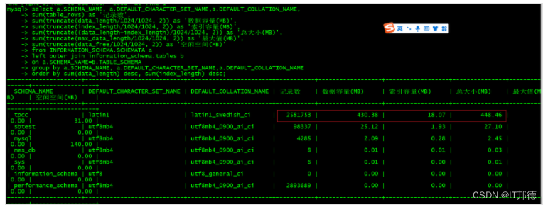 select a.SCHEMA_NAME, a.DEFAULT_CHARACTER_SET_NAME,a.DEFAULT_COLLATION_NAME, sum(table_rows) as '记录数', sum(truncate(data_length/1024/1024, 2)) as '数据容量(MB)', sum(truncate(index_length/1024/1024, 2)) as '索引容量(MB)', sum(truncate((data_length+index_length)/1024/1024, 2)) as '总大小(MB)', sum(truncate(max_data_length/1024/1024, 2)) as '最大值(MB)', sum(truncate(data_free/1024/1024, 2)) as '空闲空间(MB)' from INFORMATION_SCHEMA.SCHEMATA a left outer join information_schema.tables b on a.SCHEMA_NAME=b.TABLE_SCHEMA group by a.SCHEMA_NAME, a.DEFAULT_CHARACTER_SET_NAME,a.DEFAULT_COLLATION_NAME order by sum(data_length) desc, sum(index_length) desc;