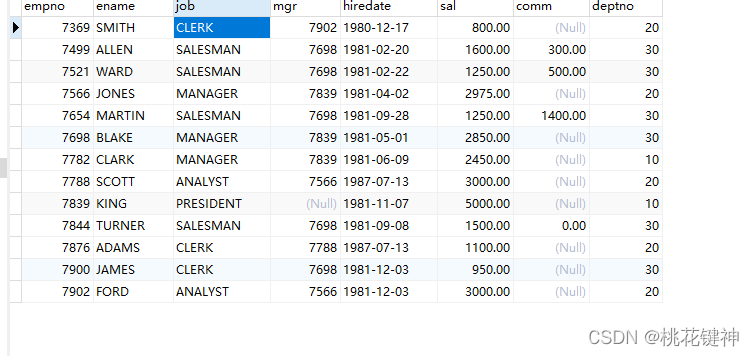 – binary 实现区分大小写 – select ename from emp where job = binary ‘MANAGER'; – select binary ‘a' = ‘a'; – select binary ‘a'; – select binary ‘A'; select * from emp where job = binary ‘MANAGER'; select a.mm,c.ename,c.job,b.dname,b.cc from (select d.deptno,min(sal) mm from emp e left join dept d on e.deptno = d.deptno where job = ‘MANAGER' group by deptno) a left join (select d.deptno,d.dname,count() cc from emp e left join dept d on e.deptno = d.deptno group by d.deptno) b on a.deptno = b.deptno left join emp c on c.sal = a.mm and b.deptno = c.deptno ;