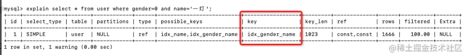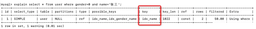 跟期望的一致,优先使用了(gender,name)的联合索引,因为where条件中刚好有gender和name两个字段。