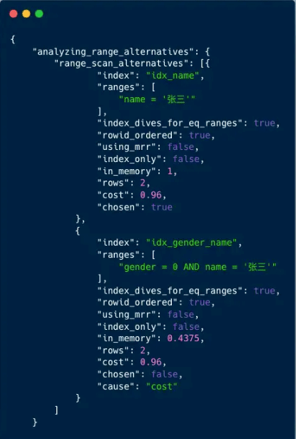 从输出结果中,可以看到优化器最终选择了使用(name)索引,而(gender,name)索引因为成本过高没有被使用。