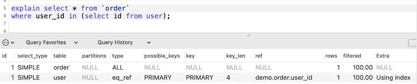 表示表连接使用到了主键或者唯一性索引,下面的SQL就用到了user表主键id。