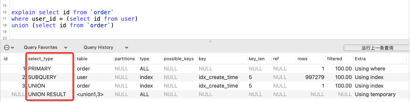 select_type表示查询类型,常见的有SIMPLE简单查询、PRIMARY主查询、SUBQUERY子查询、UNION联合查询、UNION RESULT联合临时表结果等。