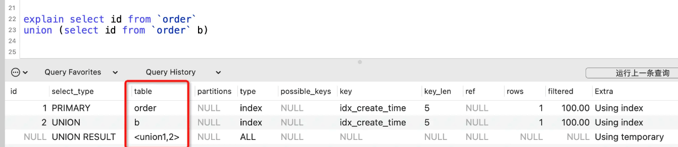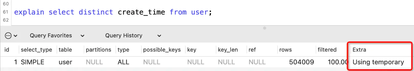 表示用到了临时表,下面的示例中就是用到临时表来存储查询结果。