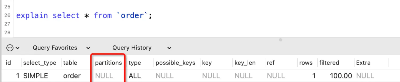 partitions表示SQL查询匹配到的分区,没有分区的话显示NULL。
