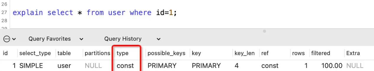表示使用主键或者唯一性索引进行等值查询,最多返回一条记录。性能较好,推荐使用。