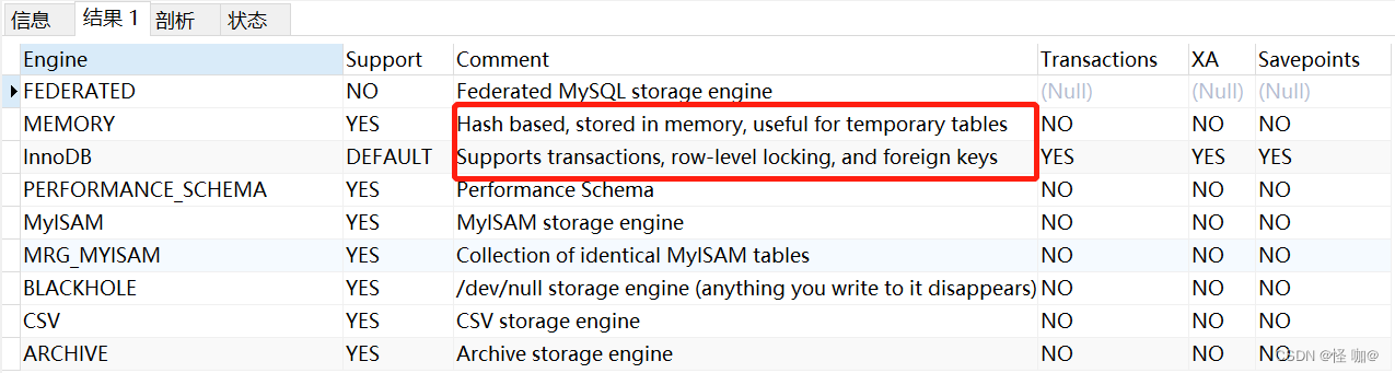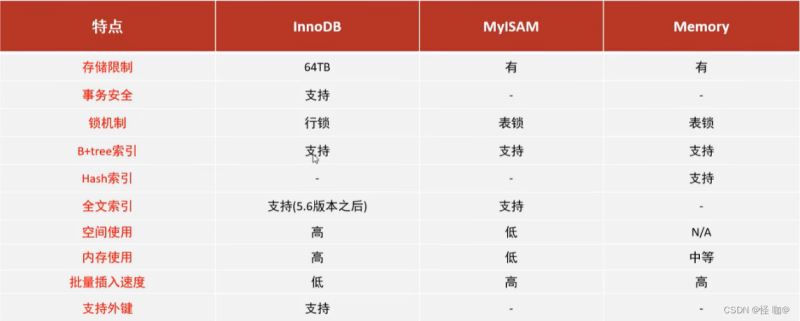 - MEMORY:将所有数据保存在内存中,访问速度快,通常用于临时表及缓存。MEMORY的缺陷就是对表的大小有限制,太大的表无法缓存在内存中,而且无法保障数据的安全性。