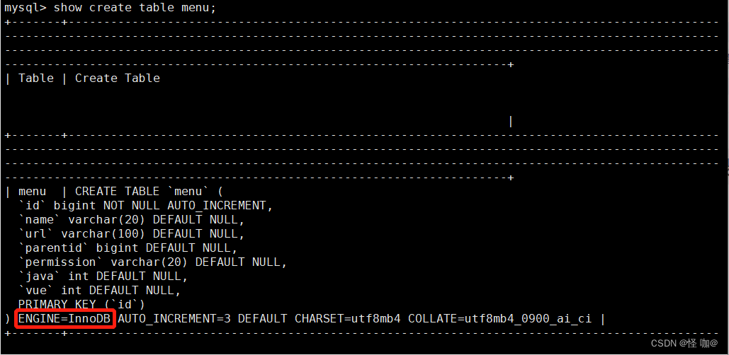 ENGINE:代表的是当前表的存储引擎AUTO_INCREMENT:代表的是自增id目前已经增到多少了CHARESET:代表的是字符集COLLATE:代表的是排序规则