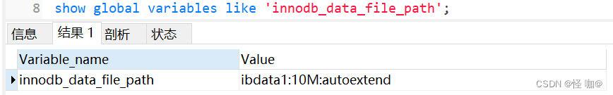 show global variables like 'innodb_data_file_path'; #查看表空间文件设置