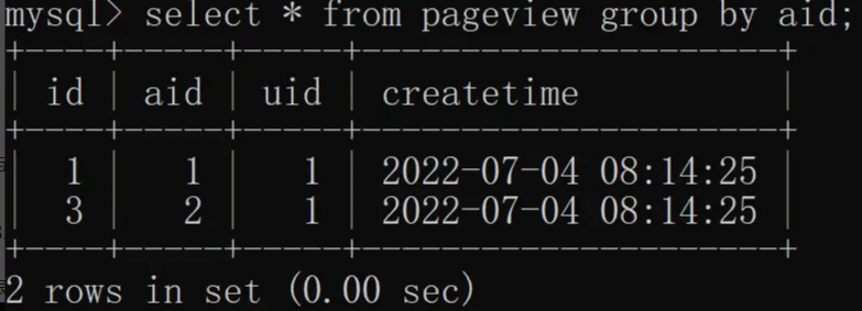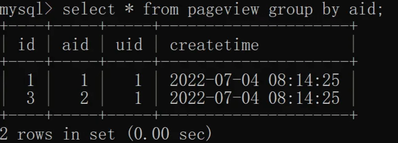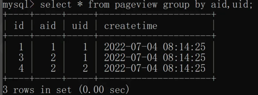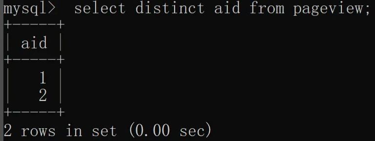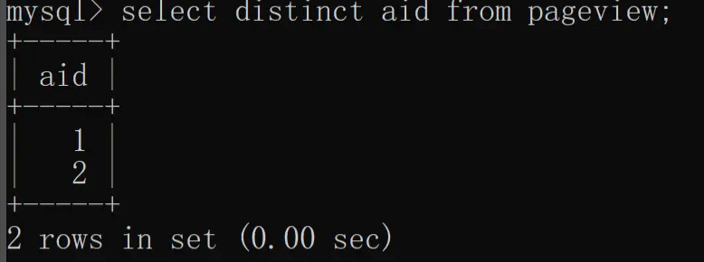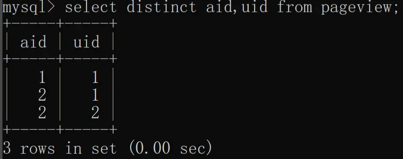 除了单列去重之外,distinct 还支持多列(两列及以上)去重,我们根据 aid(文章 ID)和 uid(用户 ID)联合去重,具体实现如下: