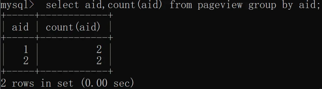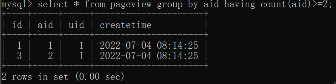 统计分组之后数量大于 2 的文章,就要使用 group by 了,如下图所示: