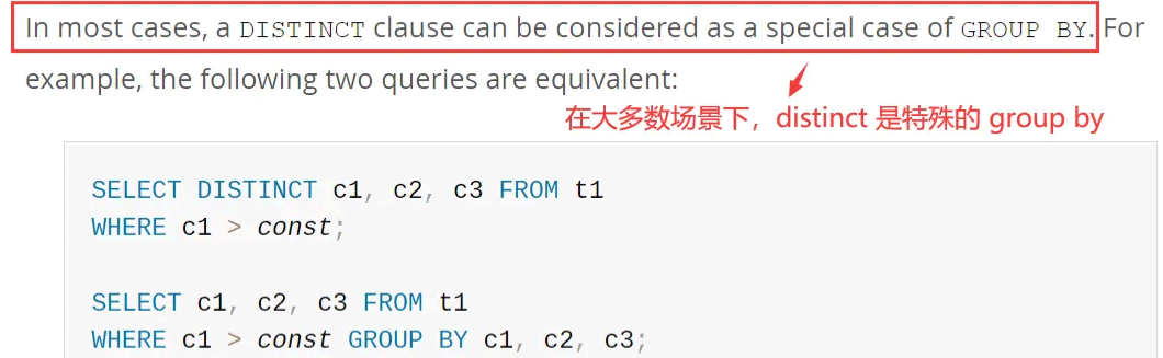 官方文档在描述 distinct 时提到:在大多数情况下 distinct 是特殊的 group by,如下图所示: