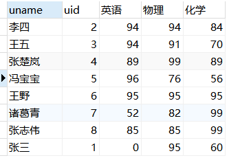 select uname,uid, -- 正常查询的字段 sum( case when course ='英语' then score -- 需要转换的字段 else 0 end) '英语', sum( case when course= '物理' then score else 0 end) '物理', sum( case when course='化学' then score else 0 end) '化学' from course group by uid