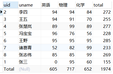 create view rtc as select ifnull(uid,'Total') uid,uname, sum(if(`course`='英语',score,0)) '英语', sum(if(`course`='物理',score,0)) '物理', sum(if(`course`='化学',score,0)) '化学', sum(score) 'total' from course group by uid with ROLLUP -- 下面是列转行代码 select uid,uname,'英语' course,英语 score from rtc where uid 'Total' and 英语>0 union all select uid,uname,'物理' ,物理 from rtc where uid 'Total' and 物理>0 union all select uid,uname,'化学' ,化学 from rtc where uid 'Total' and 化学>0