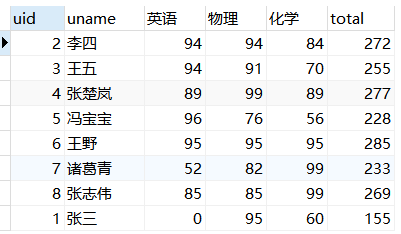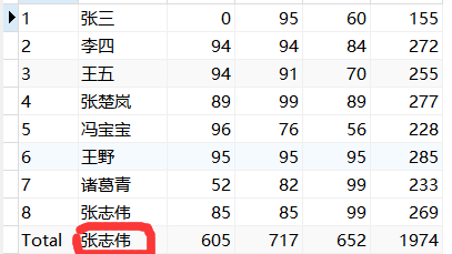 total这一列简单,直接在之前的查询基础上加一个sum(score) 'total'即可;Total这一行则可以看成之前的查询不加group by而聚合成一行。因此可以看做是两个表组合到一起如图4和图5: