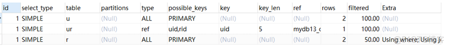 explain select * from user u, user_role ur, role r where u.uid = ur.uid and ur.rid = r.rid ;