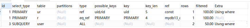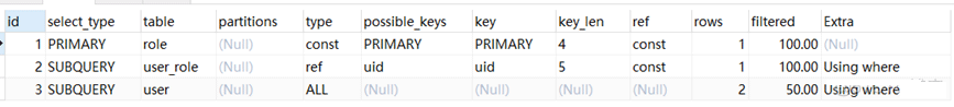 explain select * from role where rid = (select rid from user_role where uid = (select uid from user where uname = '张飞'))